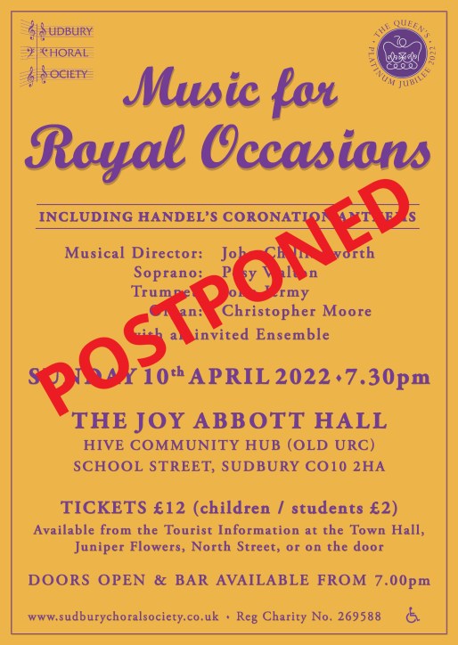 Sudbury Choral Society – A4 Poster Apr 2022 POSTPONED April 2, 2022Full resolution (2489 × 3508) ← Previous Next →